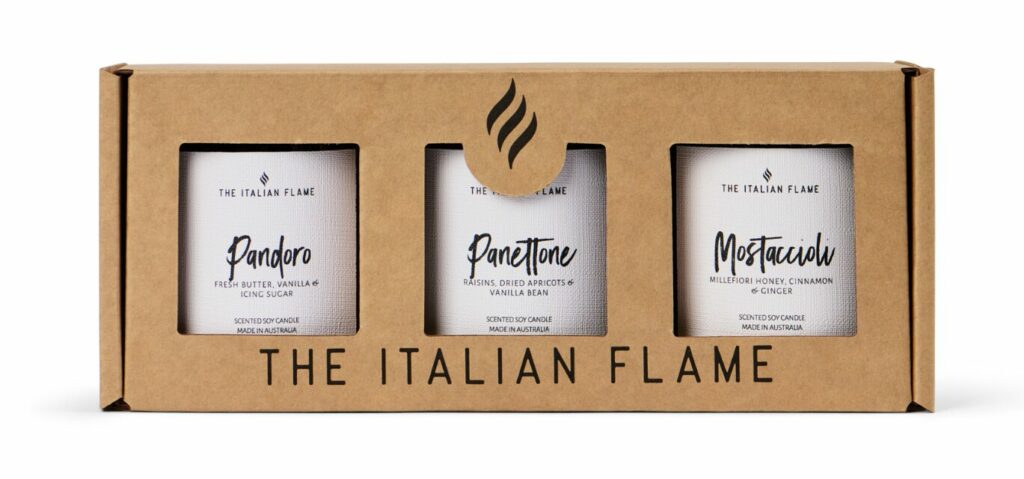 Includes 3 × 250g scented candles (Panettone, Pandoro, Mostaccioli) in a craft box. Each candle features carefully blended essential oils to evoke traditional Italian holiday aromas.