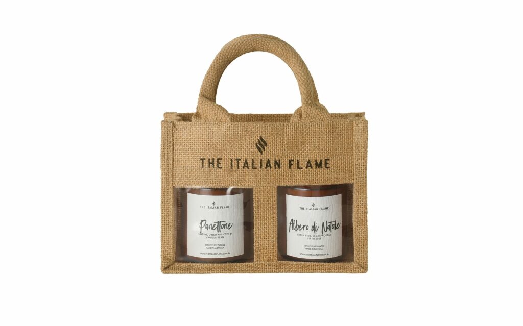 Includes 2 × 250g scented candles (Panettone, Albero di Natale) in a natural jute gift bag.