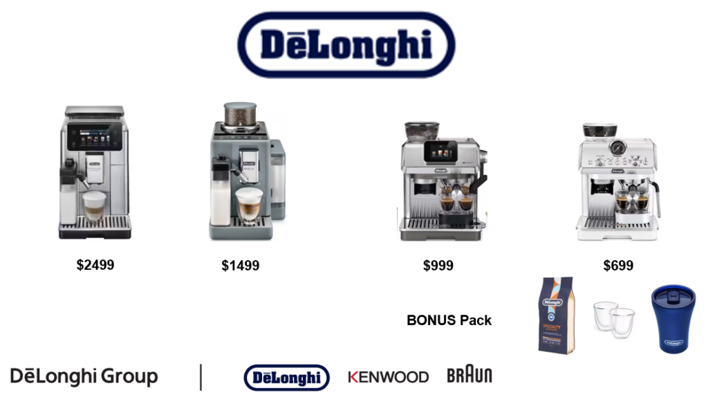 Surprise clients, colleagues, or loved ones with a De’Longhi coffee machine, an everyday luxury that transforms the coffee experience. Choose from four selected models ranging from sleek compact designs to fully automatic machines, each delivering outstanding quality and style.